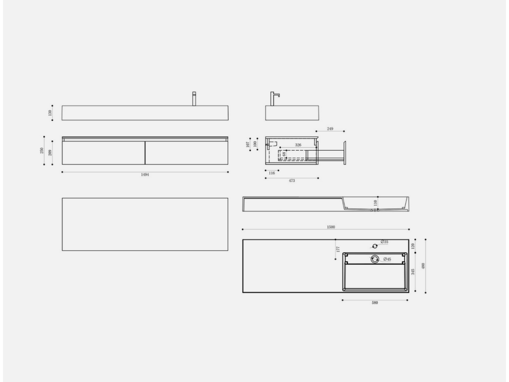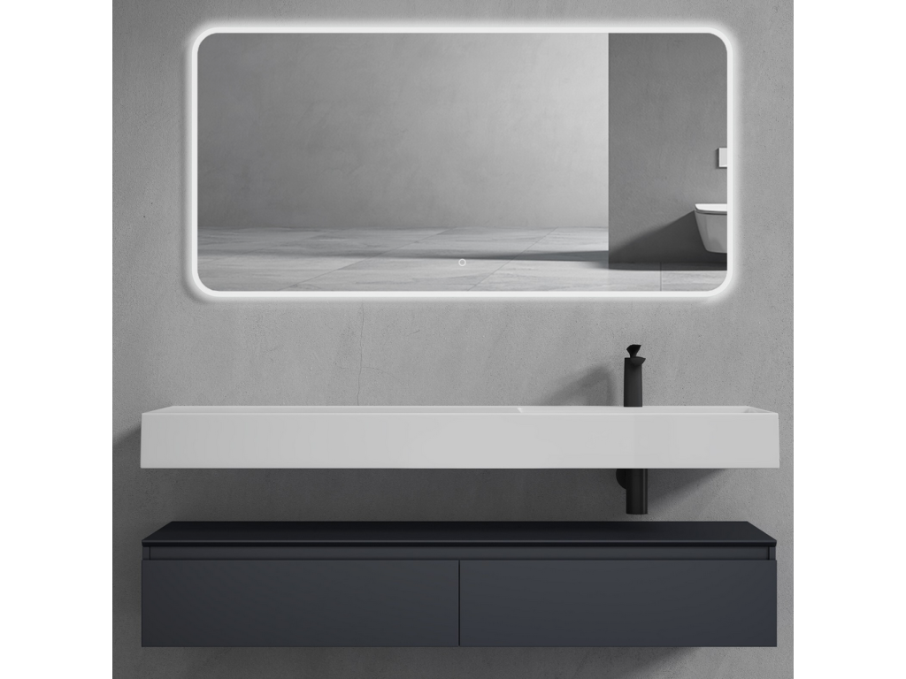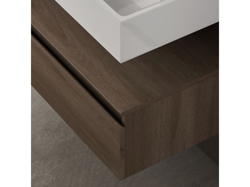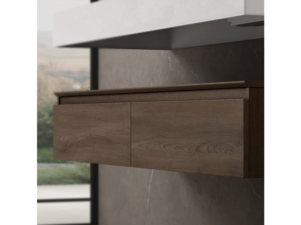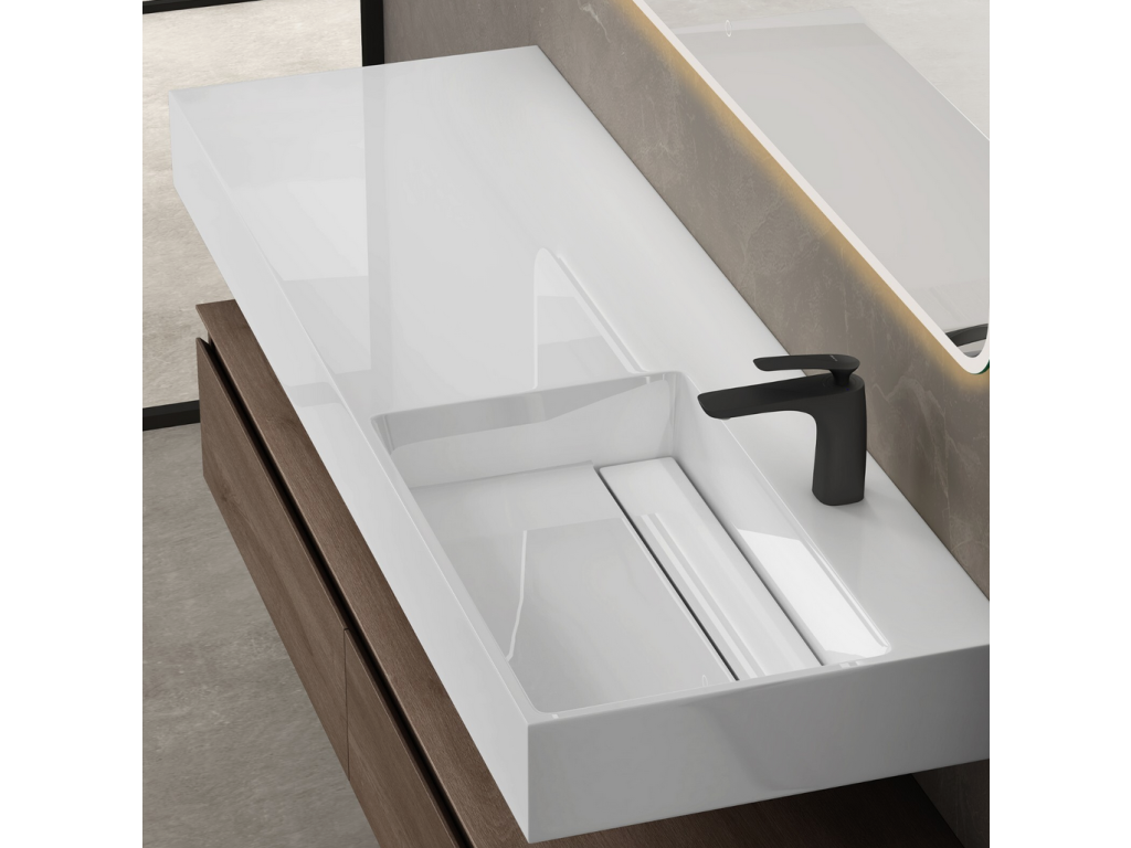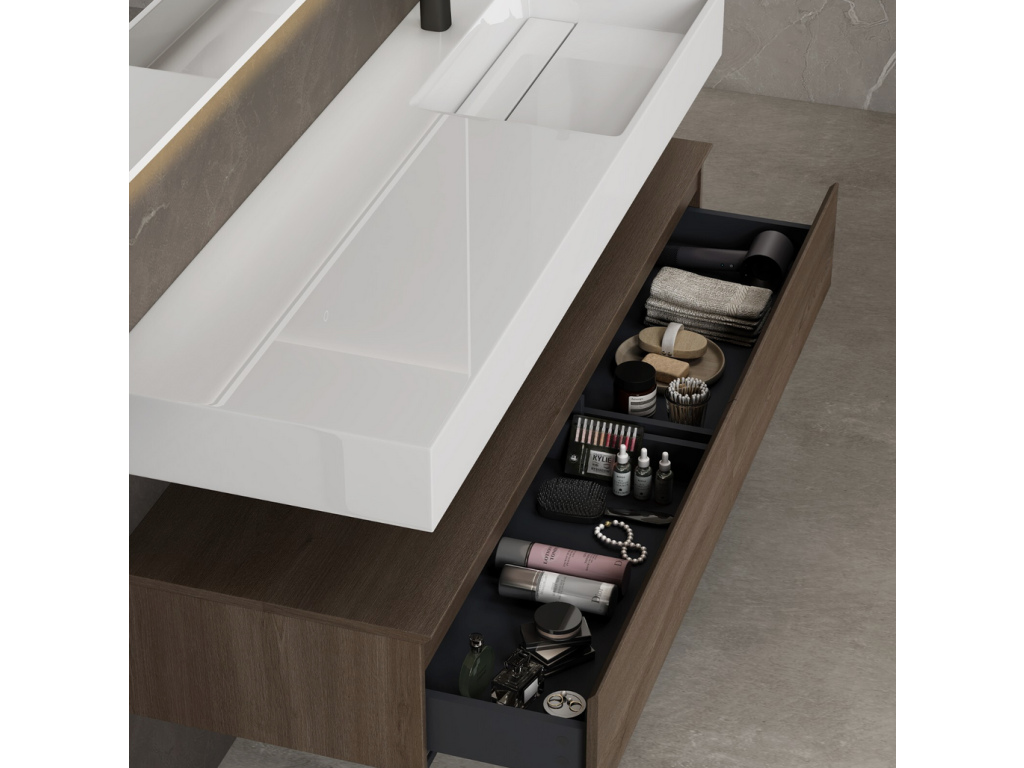 Ekologická spodní skříňka byla vyrobena z panelů bez nátěrů a šetrných k životnímu prostředí. Umyvadlo z minerální litiny bylo odlito z jednoho kusu a ručně leštěno Funkce soft-close: Kluzné kolejnice zajišťují hladké otevírání a zavírání Vybrání ve tvaru písmene U ponechává dostatek prostoru pro sifon Úchytky zásuvek, které jsou pod úhlem 45 °, vylepšují vzhled skříně velké zásuvky s úložným boxem. Snadná montáž na zeď.