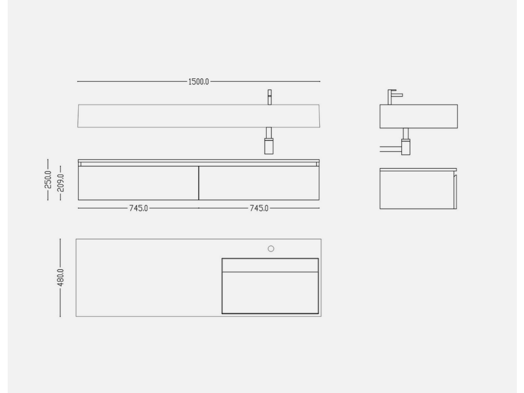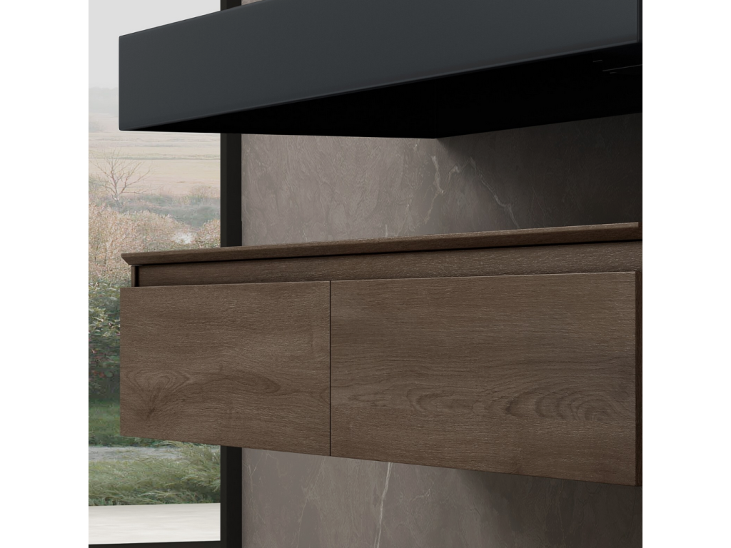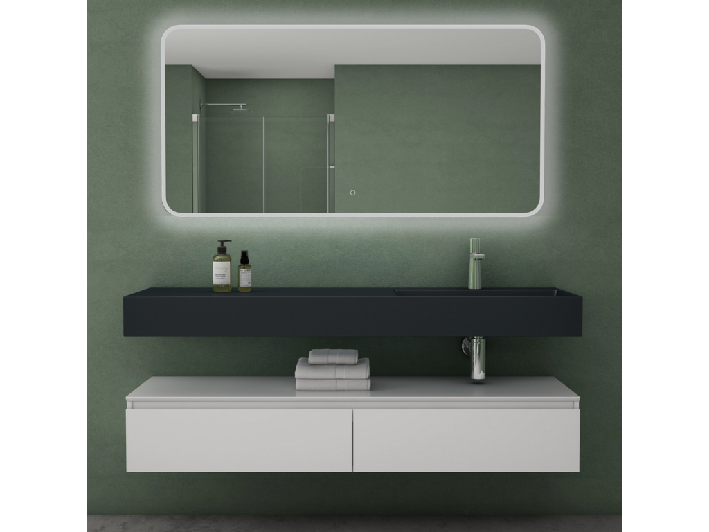 Ekologická spodní skříňka byla vyrobena z panelů bez nátěrů a šetrných k životnímu prostředí. Umyvadlo z minerální litiny bylo odlito z jednoho kusu a ručně leštěno Funkce soft-close: Kluzné kolejnice zajišťují hladké otevírání a zavírání Vybrání ve tvaru písmene U ponechává dostatek prostoru pro sifon Úchytky zásuvek, které jsou pod úhlem 45 °, vylepšují vzhled skříně velké zásuvky s úložným boxem. Snadná montáž na zeď.