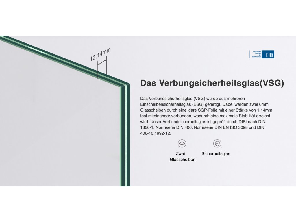 Geprüftes VSG durch DIBt nach : DIN 1356-1, Normserie DIN 406, Normserie DIN EN ISO 3098, DIN 406-10:1992-12